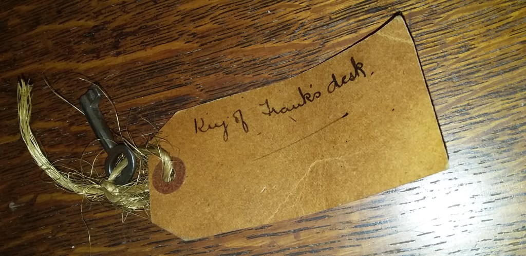 Very importantly, the key is in the top drawer, attached to a label ticket. Written in (I suppose) Annie’s handwriting: “Key of Frank’s Desk.” Interesting, as there’s no lock or keyhole in the desk, nor any of its drawers!