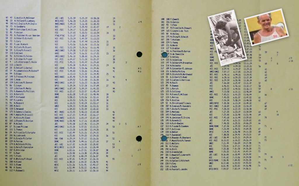 I roared in 140th – looks like 152 finishers, but maybe there was another whole page? Can’t tell – the first page is also missing so we can’t see who won. I know Chris Greeff won the singles. I spent a long time training him in the bar till late at night when the GO TO BED!!s built to a crescendo and we politely thanked Jesus, downed a last beer – and did as we were told. This was Jesus, or Dave Williams, of course, the saintly Umko barman.