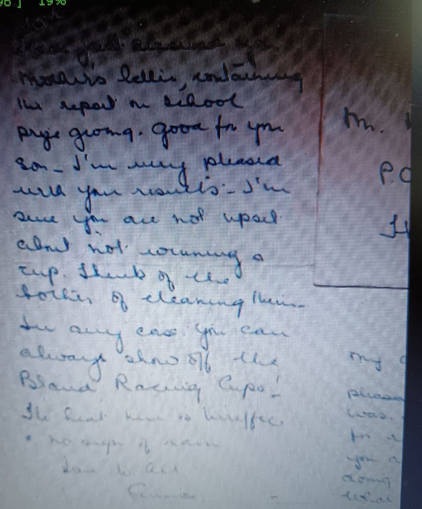 Have just received your mother’s letter, containing the report on school prize-giving. Good for you son – I’m very pleased with your results. I’m sure you are not upset about not winning a cup. Think of the bother of cleaning them. In any case you can always show off the Bland Racing Cups!