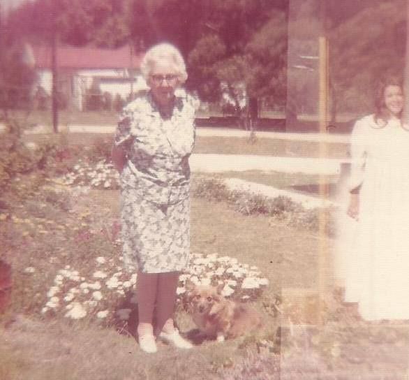 Here she is in George again round about the same time, in a dress and uncomfortable shoes cos it’s a wedding. Corgi at her feet. Not her corgi, mind you. She didn’t do animals, she played golf and drove motorcars. Also owned and ran a Caltex garage and a Volkswagen motorcar agency. At one time she sold 1200cc VW Beetles for R1199.