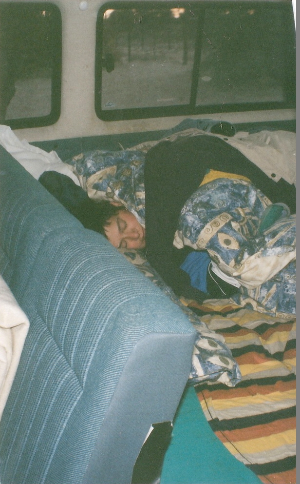 With Aitch in the kombi in the Kalahari Gemsbok Park. Like sleeping in a refrigerator. The lions knew to wait till the sun was up before getting it on; ca.1996