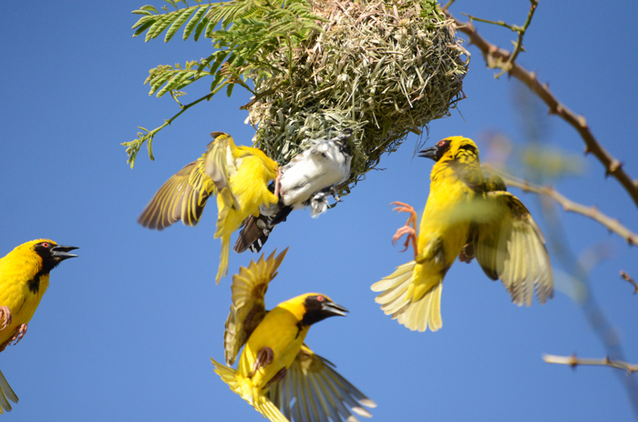 My encounter was on the last day of a Dusi Canoe Marathon back in the nineteen eighties. I was drifting along on the Umgeni River just upstream of the big N2 bridge across the river, wishing the current would do a bit more to get me to the finish at Blue Lagoon, when I heard a ruckus and saw a bunch of weavers chasing and mobbing a bird. As I got closer I saw it was a Diederik Cuckoo pulling its best aerial dogfighting maneuvres to try and escape the mob. Even flying upside down some of the time so its claws could fend off the pecking. To no avail. They beat her down into the reedbed and then down the reeds onto the water. Then I was past the scene of this neighbourhood vigilante action. So I didn’t see the end and don’t know if the Diederik was actually killed, as the Mynahs in North West Province killed the African Cuckoo. Fascinating!