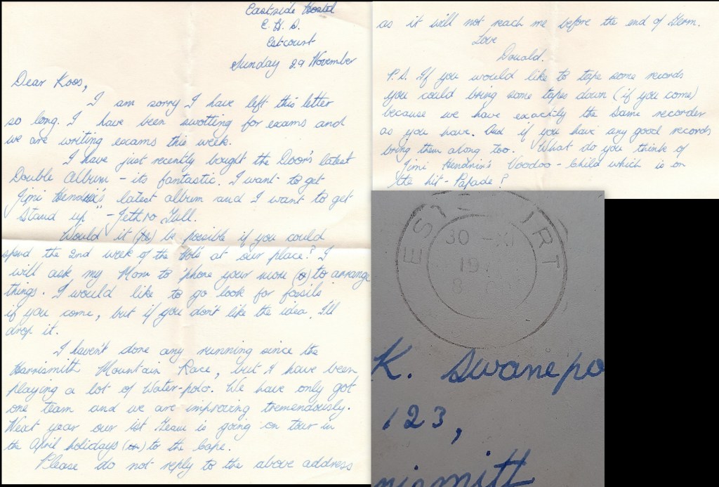 14 July 2020 – And now another letter DOES pop up: Dated 29 November no year, and the envelope franked 30 November 197_ (probly also 1971 – he gives his address as Eastside Hostel again, but says he’ll be going home soon).