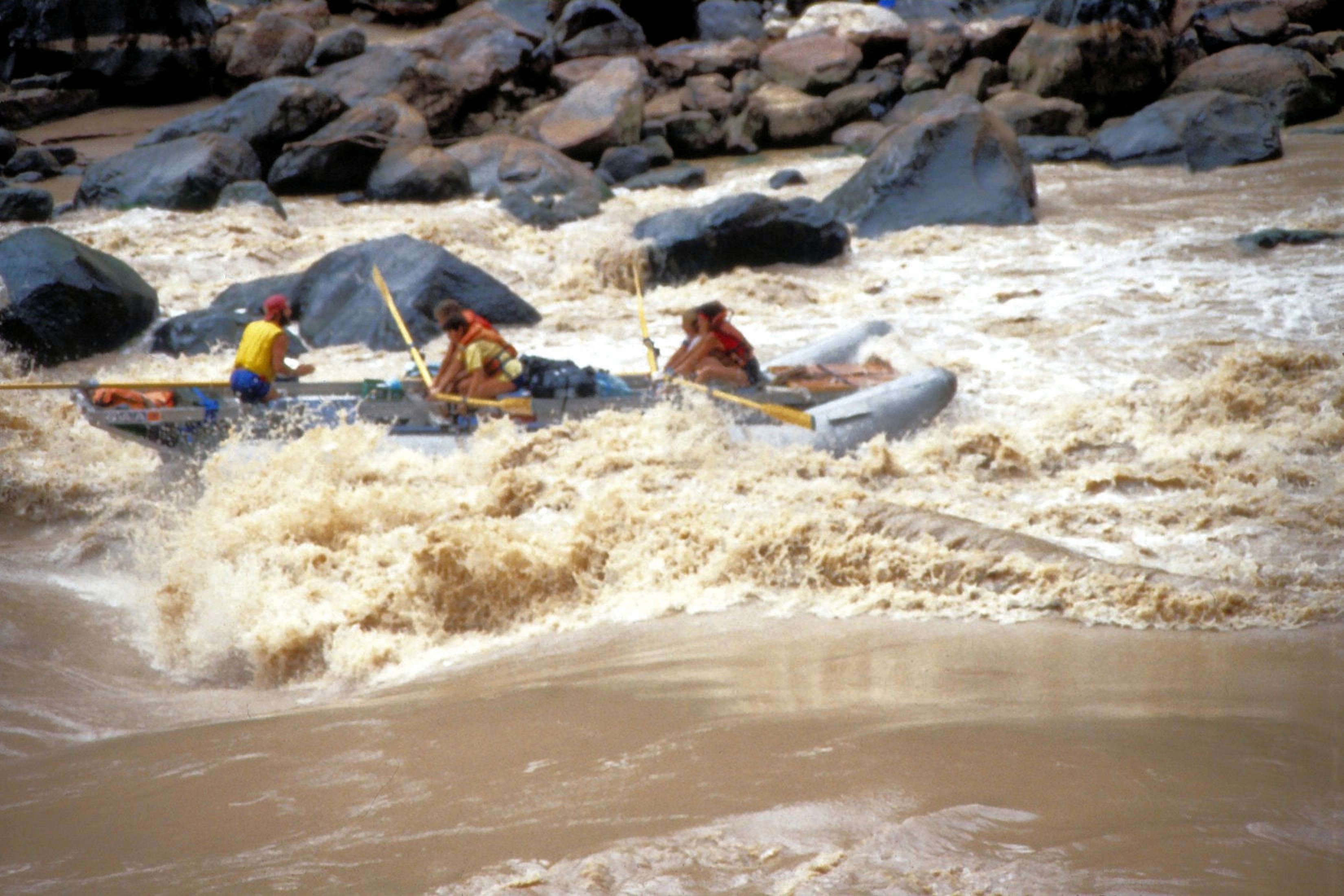 Then every so often you would sit up and listen intently. Then peer ahead with a stretched neck and drift in a quickening current as the roar of the next rapid grew in the canyon air. The river was running at an estimated high of 50 000cfs – that’s about 1650 cumecs, big water. 1984 was a high year. Once you could see where the rapid was, you pulled over and got out to scout it and plot your way through it. It was no use asking Greeff. His stock answer was ‘Down The Middle!’