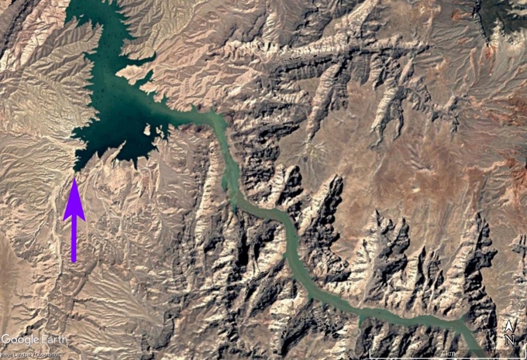 – final take-out on the lake at Pearce Ferry – the river bottom right, flowing right to left into the lake –