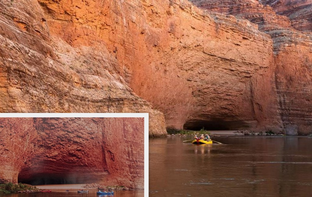 – ‘our’ five rafts with the beer – high water had shrunk this beach, but we stopped to walk up a side canyon –– our river guide Cully Erdman shows us how – he has done it before –– massive Redwall Cavern at mile 33 – pics National Geographic and oars.com – thanks! –– Herve, George & Jojo with her bikini ON –