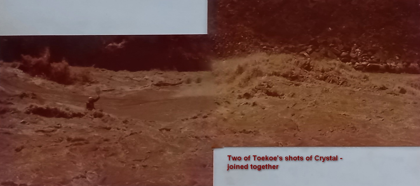 – lunch on a small sandbank – five rafts, seventeen kayaks squeeze on – the water level was up – – seated among legends as I was, I wore my langbroek out of respect – Graeme & Wendy Pope-Ellis; Wendy Walwyn; John Lee; Cully Erdman; Me; Willem van Riet; Jannie Claassens; Herve de Rauville in red cap – – Expedition Leader Greeff bombs through – – Me in Crystal rapid –