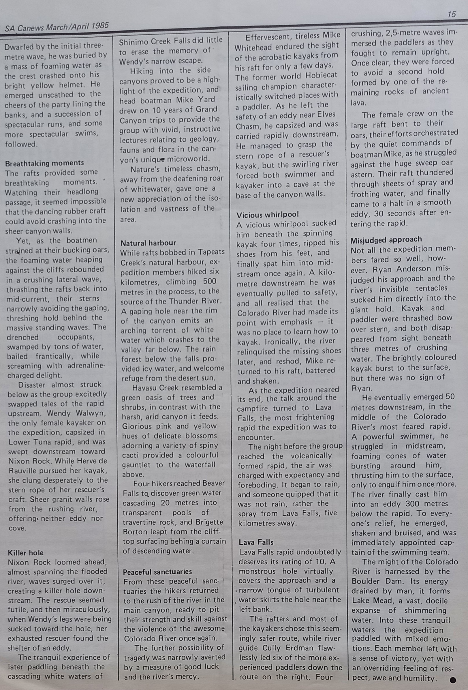 Just downstream of the confluence I got sucked under by a big whirlpool that formed under my boat that I couldn’t escape. As I went down I set up to roll but stayed down until I thought ‘I’m outa here’ as I was now loose in the cockpit and my splashie had leaked. So I bailed. Up on the surface the guys told a more dramatic tale: ‘Swanie! You disappeared for AGES! Then your boat popped up; Then your paddle popped up; And still there was no you! Then at last you popped up!’ So then they started calling me Pete Whirlpool. Lots of that muddy water stayed up my snout and I had a few bad sinus headaches but Wendy – Dave Walker’s connection – very kindly stepped in and saved my butt with strong painkillers and nightly TLC. Back in Durban a month later I was rushed into theatre by another very kind lady, my boss at Addington Hospital, ophthalmology professor Anne Peters. She took me to her ENT friend for an emergency sinus washout! As Saffeffricans say ‘Ah neely dahd!’ Some Little Colorado River mud was washed down Durban’s St Augustine Hospital’s outlet pipes into the Indian Ocean that day. Probly also had a smattering of Mainstay in it.