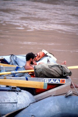 Then every so often you would sit up and listen intently. Then peer ahead with a stretched neck and drift in a quickening current as the roar of the next rapid grew in the canyon air. The river was running at an estimated high of 50 000cfs – that’s about 1650 cumecs, big water. 1984 was a high year. Once you could see where the rapid was, you pulled over and got out to scout it and plot your way through it. It was no use asking Greeff. His stock answer was ‘Down The Middle!’