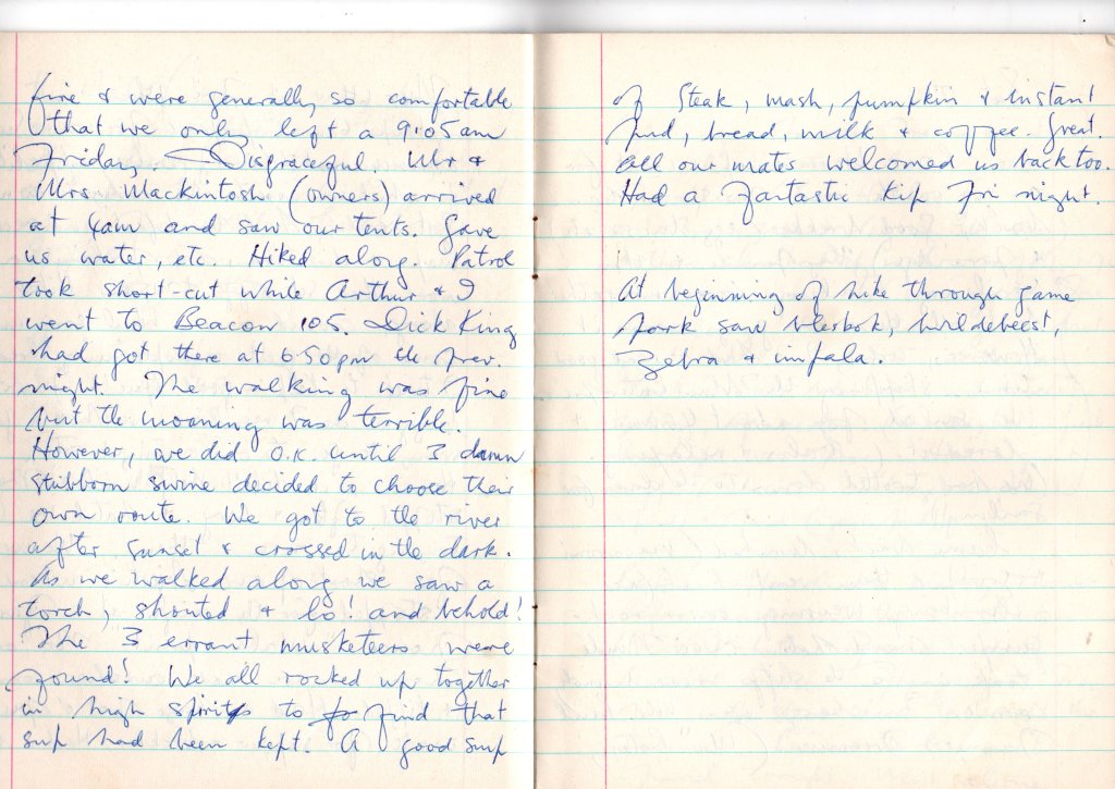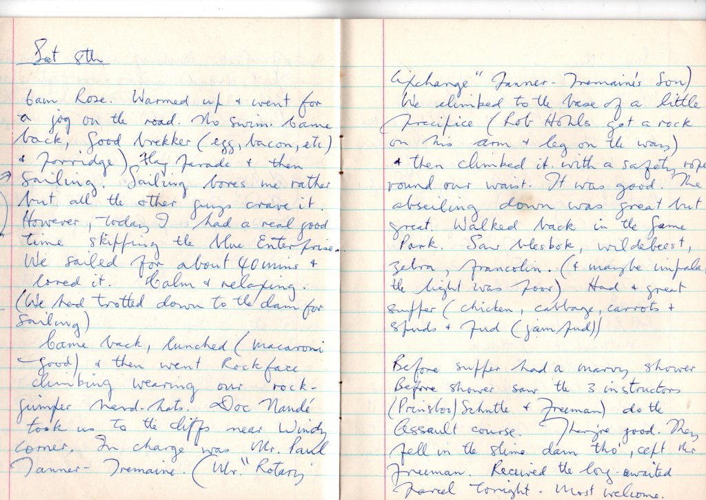 The last letter was on day 9: Our first free morning. On day 7 they had given us twenty minutes to get ready and leave on a two day expedition. Find your way by map to various waypoints. There was ‘not much discipline’ in our patrol,according to poor little ole me: ‘Leaders had been chosen who were not leaders’ (according to yours truly!) and not much hard hiking was done. I saw we were way behind schedule so ‘I tried to push them, but they just got mad and rested often and long.’ I did all the map and compass work and ‘they would argue like mad as to our direction without ever looking at the map!’ By nightfall we were about halfway to our intended destination. We camped and ‘the boys just wanted to turn around and go back. I refused and eventually they agreed to try and finish the course! In the morning we only set off at 9am! I worked out shortcuts for them while one of the guys and I walked to the beacons and took bearings; we would then catch up to them again. We walked along to ‘a chorus of moaning and swearing, mainly at me for ‘rushing them.’ Anyway, eventually we crossed the Bushmans River in the dark and arrived back at camp at 7.30pm. At least we did finish the course! And luckily there was a good supper waiting.’
