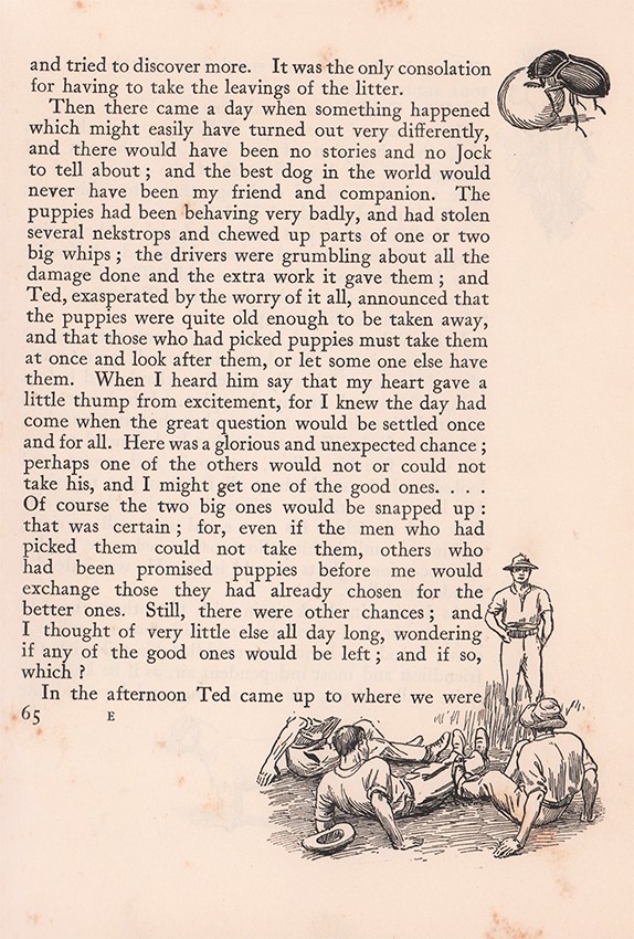 First edition, First impression. 475 pages, colour frontispiece, plates and marginal illustrations, dark green cloth with gilt titling and gilt vignette of Jock on the upper cover, light foxing throughout mainly in the text and on the page edges, with the drawings of a dung beetle pushing his load with his front legs rather than his back legs on pages 65, 337 and 457 and Snowball the horse being dragged out of the river on page 316 – these drawings were changed in later impressions. The spine is starting to fray at the top and the bottom, the bottom edge of the upper cover and the corners are slightly scuffed, housed in a specially made oatmeal textured cloth solander box with a dark green title label gilt on the spine, a very good copy of the first edition. Overall Condition: A Very Good Copy